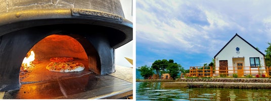 季節と時間帯で全く異なる彩りを魅せる東郷湖を目の前に、グランピングやカフェを備えた複合施設。デッキテラスから広がる湖面には、心地よい木のグランピングがあり、はわい温泉を楽しむこともできます。また湖屋カフェでは、本場ナポリ製の石窯で焼き上げる本格ピッツァと湯梨浜町の食材を使った贅沢サラダなどのお料理を味わうことができます。