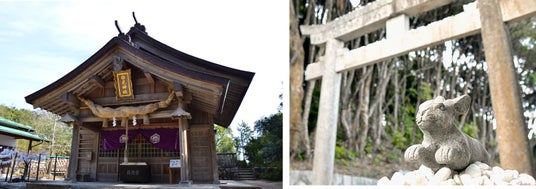 白兎神社の祭神「白兔神」とは日本神話に登場する「因幡(いなば)の白うさぎ」。大国主命と八上姫との縁をとり持った兎が縁結びの神様として祀られた由緒ある神社です。2010年に日本で初めてのラブストーリーの発祥地として、「恋人の聖地」にも認定されました。ご縁石に埋もれた兎の像が可愛い存在です。