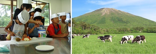 のどかな風景が続く大山放牧場内にあるレジャー施設。周辺では数多くの牛が放牧され、間近にふれ合うことができます。みるく工房では、大自然の中で育った牛から絞り出された生乳を使ったアイスクリーム作り体験、バター作り体験などができるので、夏休みの自由研究にもおすすめです。