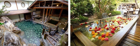 敷地内に源泉を持った、自家源泉かけ流しの天然温泉。三朝随一の湯量を誇り、肌あたり柔らかな湯が溢れる十二趣の湯処があります。1,000坪に広がる日本庭園風呂は、閑静な庭園に包まれた「庭の湯」と源泉の滝を囲む「滝の湯」の2つのゾーンがあり、異なる趣でくつろぐことができます。名物の「ばら妃乃湯」では200輪のバラがお湯に浮かび、バラの香りに包まれ優雅なひとときを満喫いただけます。