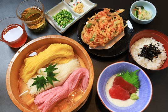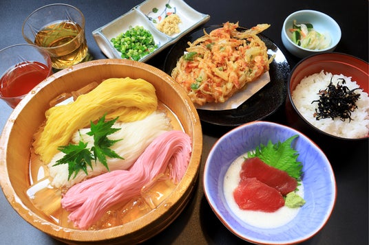 ミニSL列車が食事を運ぶ個室のお食事処お狩場では、「三色そうめん御膳」を夏限定でご用意。梅、たまごを練りこんだそうめんとスタンダードな白いそうめんの三種類を醤油出汁のめんつゆと梅の酸っぱさが病みつきになる梅つゆの2種類の御汁で楽しむことができます。お食事のみの利用も可能ですので、是非ご利用ください。