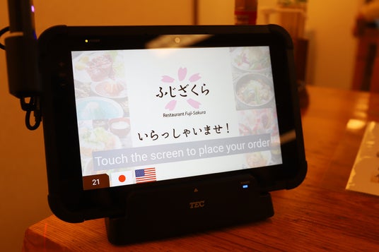 お食事処ふじざくらでは7月よりタッチパネル式オーダーシステムを導入。日本語と英語の2言語での対応が可能となっています。タッチパネルには、メニュー詳細などが記入できるため、英語による口頭での接客が削減されます。また、これによりオーダーミスやスタッフ不足などの問題が解消される他、繁忙期は、お客様の待ち時間短縮にもなります。