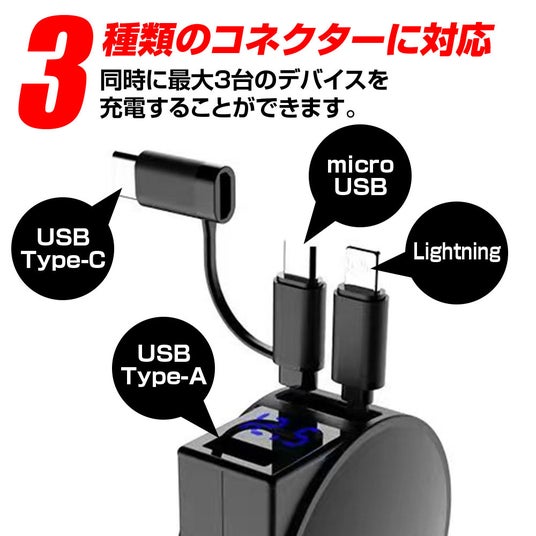 Lightning(iPhone)、micro USB(Android)、type-C(iPad、Galaxyなど)、などに対応可能。同時に最大3台のデバイスを充電することができます。
