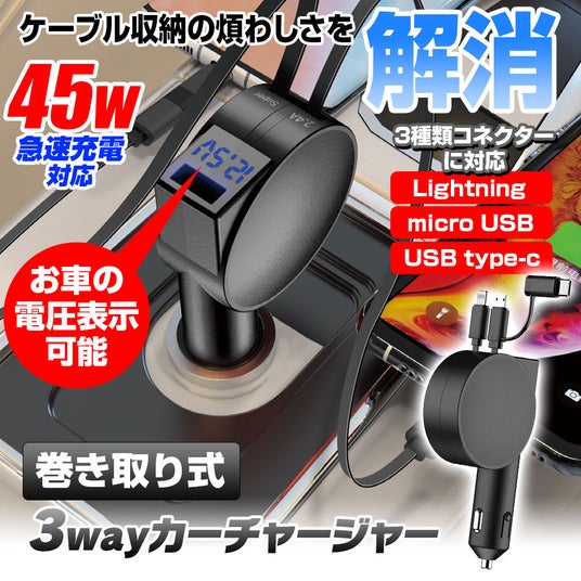 MAXWIN巻き取り式3wayカーチャージャーPCA35-Bが楽天市場とYahoo!ショッピング半額の1,640円で販売を開始しました