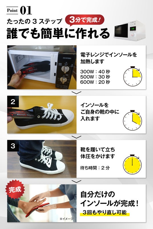 作り方はたったの3ステップ。電子レンジで加熱し、インソールを靴の中に入れて、靴を履くだけ。