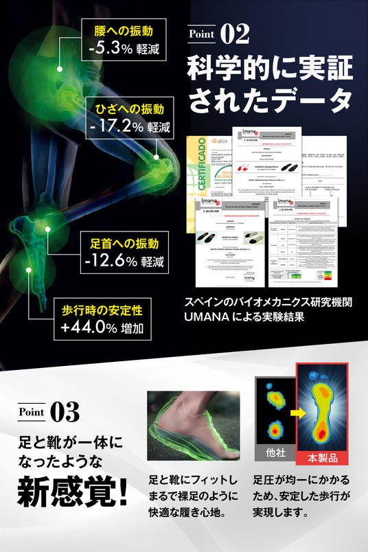 スペインの足病医で検証された腰・ひざ・足首の振動減少、歩行時の安定性の結果があり、足腰に不安のある方におすすめのインソールです。