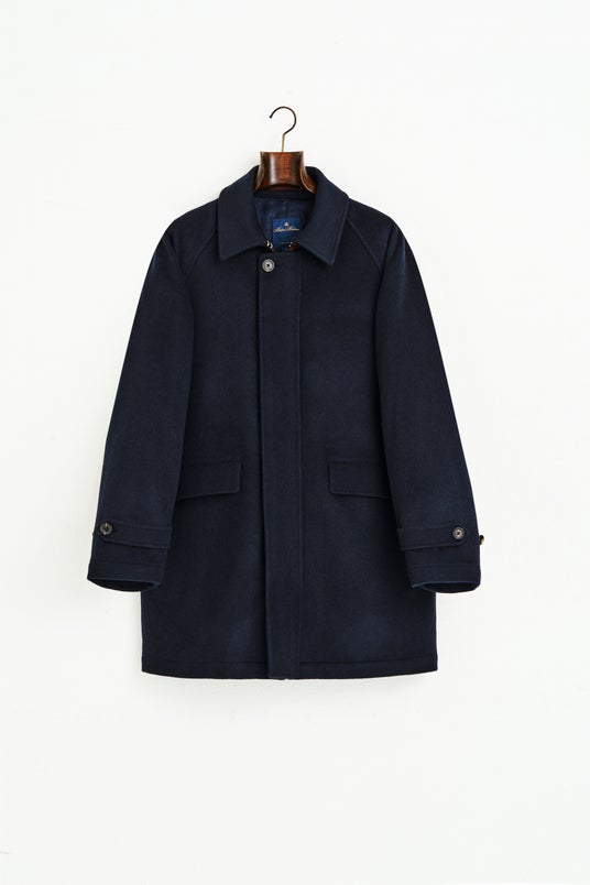 カシミヤ混のスーパー120'sのウール生地を使用。ヒップがちょうど隠れるくらいの絶妙な着丈、そして比翼仕立ての前合わせがすっきりとした印象をもたらし、日常のあらゆるシーンに溶け込んでくれます。襟付け部分をブラウン生地に切り替えるなどこだわりも。