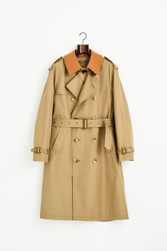 1980年代のトレンチコートのディテールをすべて踏襲した一着は、超高密度なコットン×ポリエステル生地を採用し、取りはずし可能なウールの襟、ゴールドのライニングが特徴。アンブレラヨークやインバーテッドプリーツにより、後ろ姿もサマになります。