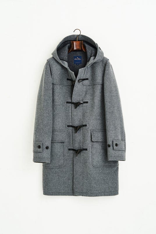 水牛の角によるトグルをブラックに統一することで、シックな印象に仕上げたダッフルコート。加えて、往年のダッフルはフードがぺたっとしてしまうものも少なくありませんでしたが、こちらは三枚接ぎゆえ立体的。チンフラップを使えばよりポイントになります。