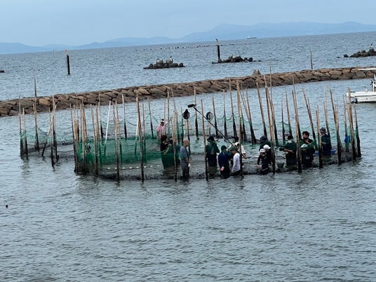 クラスから代表して7名の児童が教室を飛び出し、実際に大阪湾へ。漁港の漁師さんご協力のもと「すだて漁」の体験をしたり、とれたてのお魚を味わったりと、貴重な体験をさせていただきました。