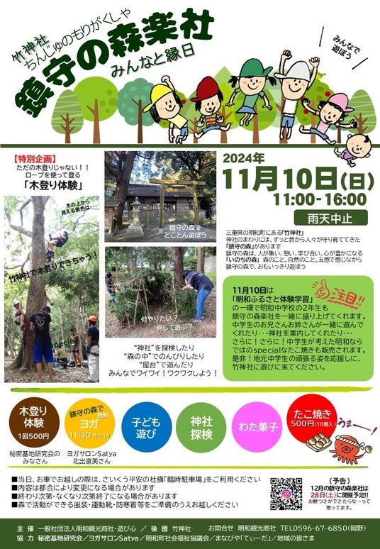 明和町の観光地域づくりを推進する一般社団法人明和観光商社(本社:三重県多気郡明和町、以下明和観光商社)は、三重県明和町(町長:下村由美子)とともに取り組む持続可能な観光地域づくり事業において、地域課題の解決を目指すさまざまな取り組みを募集し、採択された10件のプロジェクトに対し「めいわ観光まちづくり支援金」の給付を行います。このたび、自然の中での遊び(体験)やさまざまな出会いを通して、子どもたちの豊かな心を育む活動に取り組んでいる「遊び心(代表:岡野こころ)」が、竹神社の鎮守の森を活用した体験イベント「鎮守の森楽社」を11月10日(日)に開催します。
