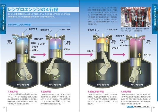 自動車のメカニズムを、実物のパーツ写真や断面図などのイラストで見せながら解説しています。「走る・曲がる・止まる」といった動きを実現するための基本的な構造をイメージしやすく、理解が進みます。