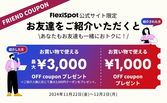 お友達にFlexiSpotの紹介コードを送ると、紹介した方とされた方の双方に、最大3,000円分の割引クーポンをプレゼントいたします。