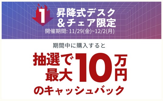 昇降デスクおよびオフィスチェアの販売台数が目標に達すると、抽選で最大6名様に購入金額の最大10万円分をキャッシュバックいたします。