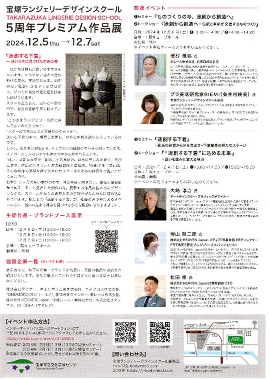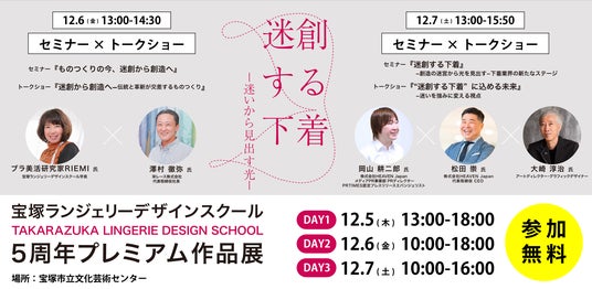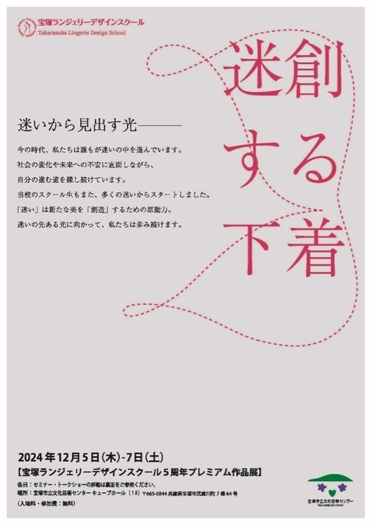 宝塚ランジェリーデザインスクール(所在地:兵庫県宝塚市、学長:ブラ美活研究家RIEMI/粂井利映美)は、開校5周年を記念し、宝塚市文化芸術センターにてプレミアム作品展を開催する。2024年12月5日(木)~7日(土)の3日間にわたって行われる同作品展では、スクール在校生・修了生22名の作品展示、同校講師・著名デザイナーの作品展示、下着関連企業の特別ブースなどが一堂に会する。また、5周年記念プログラムとして、資材メーカートップや下着製造販売会社社長、ブランディング・PRのスペシャリストなどの豪華なゲストを招いた、トークショーやセミナーの特別イベントも会場にて同時に開催。混とんとした時代の中で、迷いから創造を生む過程、下着業界の次なるステージの予測など、多様なアプローチで未来の下着業界につなげるヒントを投げかける。