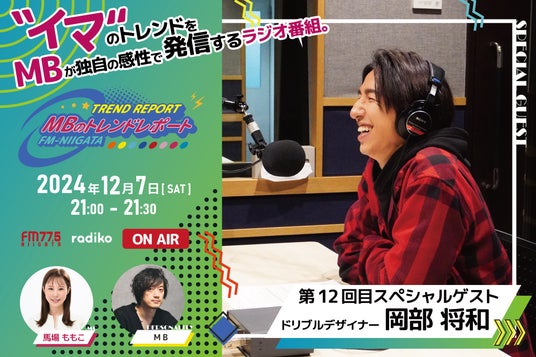 「企業の情報と印象をデザインする」をコンセプトに掲げ、メディアとWEBとオフラインを融合させたマーケティング戦略を提供する、株式会社アナログPR(本社:東京都港区、代表取締役:松浦啓介)は、弊社企画のラジオ新番組「MBのトレンドレポート」(FM-NIIGATA)の第12回目のスペシャルゲストに、岡部将和さんをお呼びして2024年12月7日(土) 21:00~放送することをお知らせいたします。