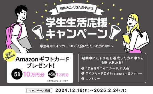 ライフカード株式会社(本社:神奈川県横浜市/代表取締役社長:増井 啓司)は、2024年12月16日(月)から2025年2月24日(月)の期間限定で「学生生活応援キャンペーン!」を実施します。