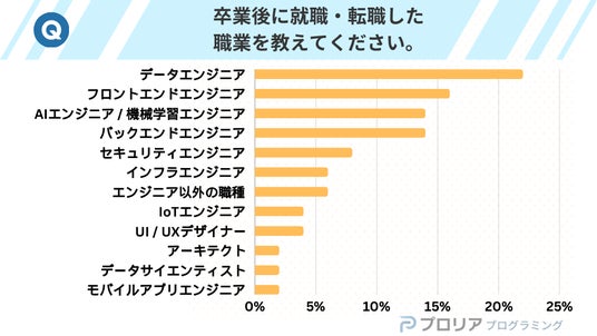 職種別では、「データエンジニア」が22%でトップとなり、「フロントエンドエンジニア」(16%)や「AIエンジニア / 機械学習エンジニア」(14%)が続きます。高度なスキルを求められる職種への転職が実現していることが明らかになりました。