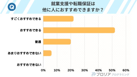 調査の結果、転職支援について「すごくおすすめできる」(22%)と「おすすめできる」(52%)を合わせた74%の方が高い満足度を示しました。一方で「あまりおすすめできない」は6%、「おすすめできない」は0%と、全体的に好意的な評価が得られています。多くの人が高評価を示す結果は、スクール側のサポート体制が有効に機能している証といえます。