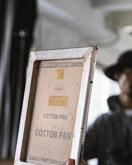 手捺染が主な手法のCOTTON PANですが、今回はステンシルによる表現。型抜き版にスプレー顔料を吹きかけることによる表現は、1点1点加減による個体差が生じ、手作業を直に感じていただけます。