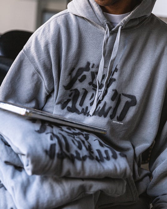 影のステンシルと、色落ちたフーディを掛け合わせ。COTTON PANとCONFECTが、救われる言葉に乗せて共作。