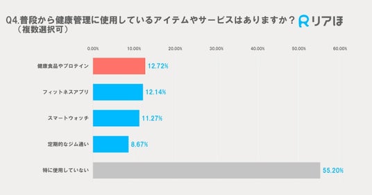 「特に使用していない」という回答が55.20%を占め、健康管理アイテムやサービスが広く普及していないことが明らかになりました。しかし、「健康食品やプロテイン」(12.72%)や「フィットネスアプリ」(12.14%)など、一部のアイテムやサービスは利用されていることが分かります。