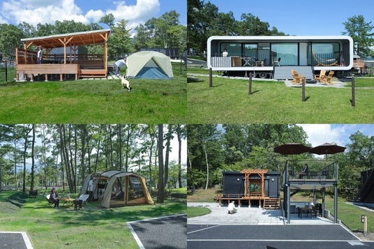 (左上)ルーフデッキ付き ドッグ・オートキャンプサイト、(左下)オートキャンプサイト(右上)トレーラーヴィラ、(右下)トレーラーコテージ
