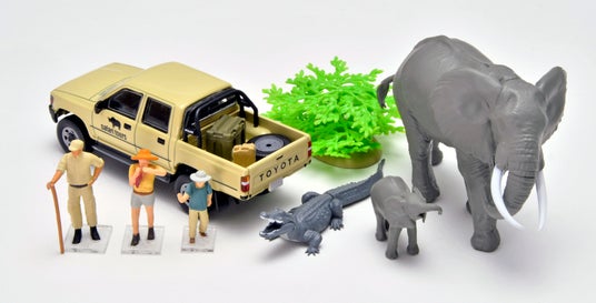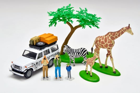 本商品に付属の動物フィギュアはキリンの親子・シマウマ(ジオコレ64#カースナップ28aサファリ1に付属)、ゾウの親子・ワニ(ジオコレ64#カースナップ29aサファリ2に付属)の6種類。海洋堂の1/35スケールプラスチックモデルキット「ARTPLA(アートプラ)」※2の造形データを基に、1/64サイズにリスケールしました。