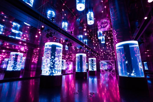天井の球形LEDと水槽照明が和楽器の音色に合わせて明滅し、桜色の光が無数に広がります。