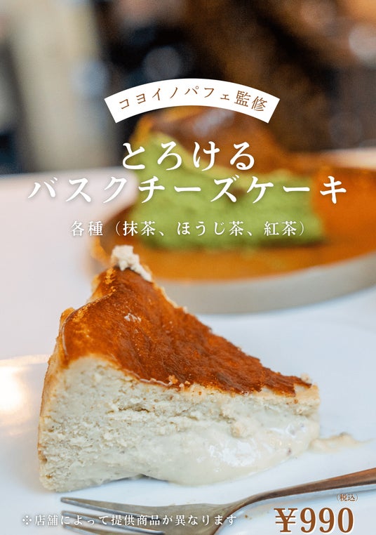 「抹茶のバスクチーズケーキ」は、京都の宇治抹茶を100パーセント使用し、ぎりぎりの焼き加減に調整することで滑らかでとろけるような口溶けが特徴です。食べる箇所によって半生食感からベイクドの食感まで様々な食感をお楽しみいただけます。