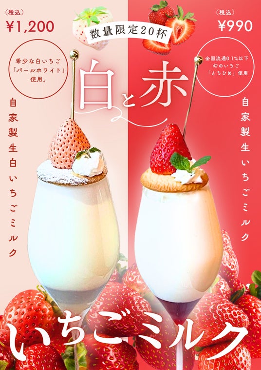 今年は、赤と白の2つのバーションからお選びいただけます。特に白いちごは流通量の少ない希少ないちごを使用しており、いちごの精算が終了次第提供終了となるため、お早めにご来店ください。