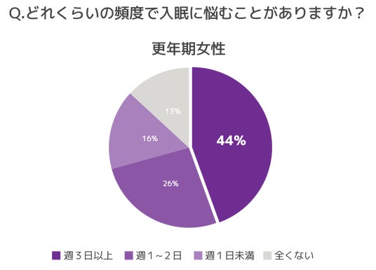 女性は男性よりも質の高い睡眠がとれた夜が少ないと報告しています(女性は週3.83回、男性は週4.13回)。特に更年期は、睡眠に影響を与える重要な要因ですが、見過ごされがちです。更年期の女性の44%が、週に少なくとも3回は入眠困難を経験していると報告しています。