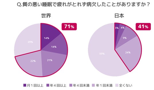 - 世界全体では、回答者の71%が睡眠の質が原因で病欠。日本人においては41%。
