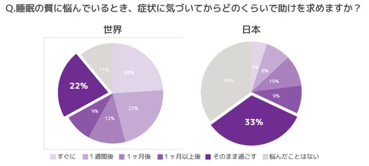 - 日本の回答者の37%が週に3日以上入眠に苦しんいるが、改善のためにすぐに行動する人は5%。
