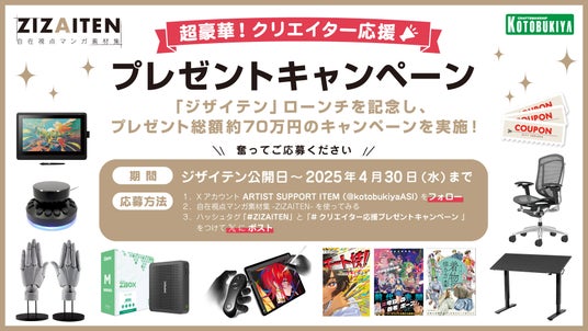 また、自在視点マンガ素材集-ZIZAITEN-公開を記念したプレゼントキャンペーン「クリエイター応援プレゼントキャンペーン」の開催もお知らせいたします。