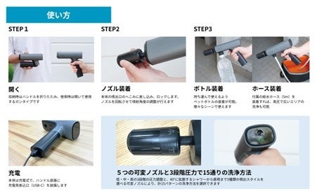 「1台あると家じゅうの掃除にいろいろ役立ってくれる洗浄機が、とっても小さくなりました。水道ホースやコンセントにつながずに使えて、折りたためる取り回しやすいサイズだから、思いついた時にサッと取り出せる気軽さが魅力。ノズルを付け替えずに先端を回すだけで噴射の広さを選べるのも、気が利いたポイントです。」