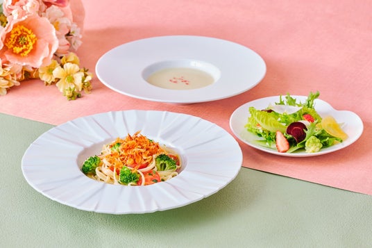 ランチA:春キャベツとベーコンのクリームスープ/苺とモッツァレラチーズのガーデンサラダ/鶏モモ肉のソテー ピペラードソース ランチB:春キャベツのクリームスープ/苺とモッツァレラチーズのガーデンサラダ/桜エビとチェリートマト、ブロッコリーのペペロンチーノ Free Drink