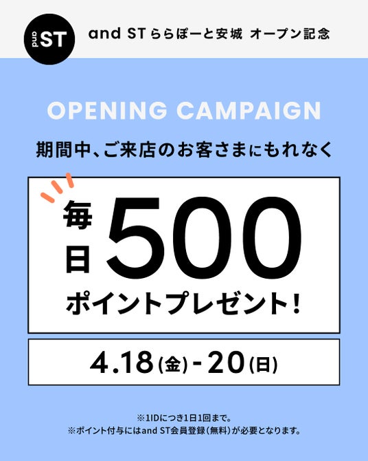 「Play fashion!」をミッションに掲げ、”グッドコミュニティ共創カンパニー”を目指す株式会社アダストリア(本部:東京都渋谷区渋谷2-21-1、代表取締役社長:木村 治)は、OMO型店舗「and ST(アンドエスティ)」の出店を含めたビジネスの拡大を推進しています。2025年4月18日(金)、愛知県安城市にグランドオープンするららぽーと安城に今年3店舗目となる新店舗をオープンいたします。 and STは、「GLOBAL WORK(グローバルワーク)」、「niko and ...(ニコアンド)」などの30を超えるブランドのウィメンズ、メンズ、キッズアパレルアイテム、雑貨アイテムが集結するOMO型店舗で、アダストリアグループのECモールand STの魅力を体験できる点が魅力のリアル店舗です。 ららぽーと安城店にも既存のand STの店舗同様、ECモール and STで”今“売れているアイテムを反映する「トレンドランキング」や人気スタッフのリアルな着こなしを映し出すデジタルサイネージ、タッチモニターを設置し、お買い物をより「楽に・楽しく」するサポートを充実させました。 さらに、店舗のオープンを記念して、来店するだけでポイントが貯まるキャンペーンの実施に加え、動画クリエイター『東海オンエア てつや』のトークショーイベントを実施いたします。 ■店舗情報 ■オープニング記念企画 1 『東海オンエア てつやさん』 のスペシャルトークショー開催 2024年秋、愛知県岡崎市を拠点に活動する動画クリエイター「東海オンエア」とコラボ企画を実施しました。 このコラボをきっかけに、今回「東海オンエア」のメンバーであるてつやさんが登場し、この日限りのスペシャルトークショーを開催します。イベントへの参加整理券は、4月18日(金)より「and STららぽーと安城店」でお買い物をされた方へ、配布します。 ■東海オンエア プロフィール 愛知県岡崎市を拠点に活動する動画クリエイター 地元岡崎の友達同士で結成された6 人組で個性の強いメンバーのいきのあった掛け合いが魅力のグループ YouTubeチャンネル「東海オンエア」https://www.youtube.com/user/TokaiOnAir 【てつや/TETSUYA】 10月30日生まれ。年齢非公開。愛知県出身。 個性が強いグループメンバーの中でも天才的な発想と圧倒的なカリスマ性を誇り、グループのリーダーとして牽引。 2020年1月に公開した「明日、キミのいない世界で」が映画出演も果たす。 同年12月には自身初のエッセイ「天才の根源」を出版するなど活躍の幅を広げている。 2022年に結婚を発表。2024年3月に地元岡崎市で「ほてる小柳津」をオープン。 公式X:https://x.com/TO_TETSUYA 2 and ST会員限定!期間限定で来店ポイントをプレゼント and STでは、店頭に設置している来店ポイント端末に and ST会員バーコードをかざすだけで来店ポイントが溜まります。オープンを記念し、4月18日(金)~20日(日)の3日間限定で、ご来店の度、毎日500ポイントをプレゼントします。 ※来店ポイントの付与は1IDにつき、1日1回までとなります。 ※and ST会員さま限定のサービスとなります。