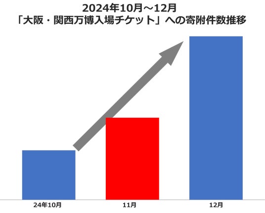 2025年大阪・関西万博は、「いのち輝く未来社会のデザイン」をテーマに2025年4月13日(日)~10月13日(月)までの184日間開催される、世界中からたくさんの人やモノが集まるイベントです。日本での開催は2005年の愛・地球博に続き20年ぶりとなり、注目が集まっています。 ふるなびでも24年10月から、一日券や複数回入場可能な通期パスなど6つの種類のチケットを返礼品として用意しており、今日に至るまで寄附件数は順調に増加しています。更に、ふるなび内の「旅行・チケット」のカテゴリーランキングでは、大阪・関西万博の入場チケットが上位にランクイン!注目度の高さが伺えます。 ふるなびでの「大阪・関西万博入場チケット」への寄附件数は、返礼品掲載開始の10月から、年末のふるさと納税需要にも後押しされる形で、増加しました。 11月からは入場チケットの一般発売も開始され、メディアでも万博への報道も増加。それに伴い万博への注目度が高まったことから、ふるさと納税を活用して万博の入場チケットを用意した人も多いのではないでしょうか。 年明け以降、ふるさと納税の利用は落ち着く時期ではありますが、大阪・関西万博の開催が近づく中、入場チケットへの寄附は変わらず増加傾向。 4月のテストラン実施に向けて、年始からメディアでの報道も活発化しており、万博への注目度は一層高まっています。こうした流れを受けて、ふるさと納税を活用し、万博訪問を計画している方も多いのではないでしょうか。 そんな中、GWや夏休みを控え、万博を訪れるついでに関西旅行を楽しむご予定の方へ朗報です。実は…ふるさと納税をフル活用して大阪旅行ができるってご存知でしたか?