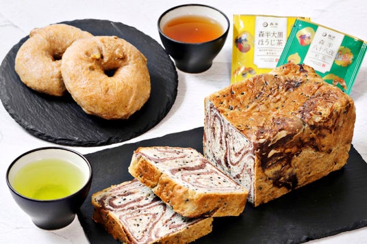 監修したお茶に合うパンセットを4種類ご用意。「森半」の『八十八夜煎茶』、『大黒ほう