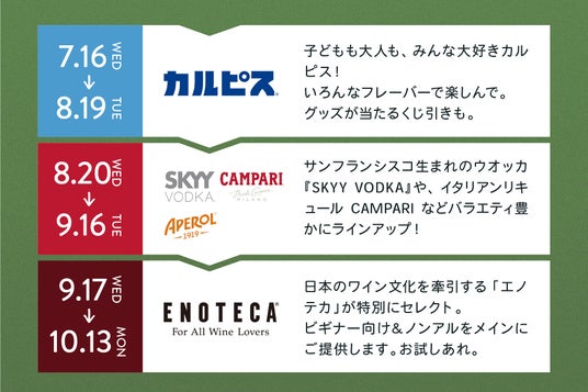 こちらも毎年大好評! 有名メーカー、ブランドなどが期間限定で次々と登場する「POP UPブース」「これも飲み放題でいいの!?」「こんな飲み方・楽しみ方があるんだ!」そんなオドロキの声が聞かれるうれしいラインナップ! 期間が終わるともう飲めない! スケジュールチェックをお忘れなく!