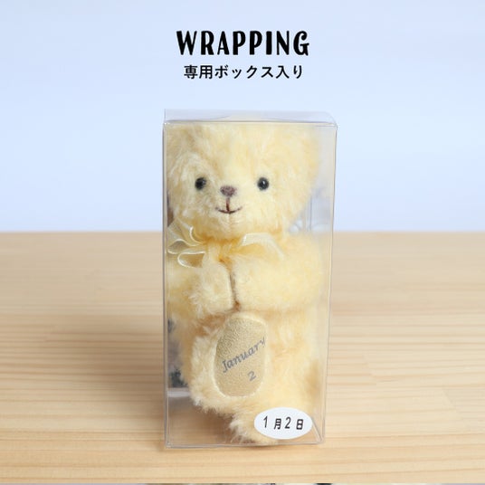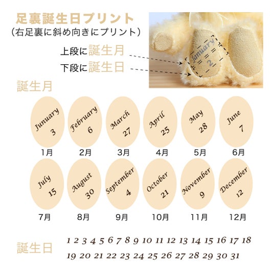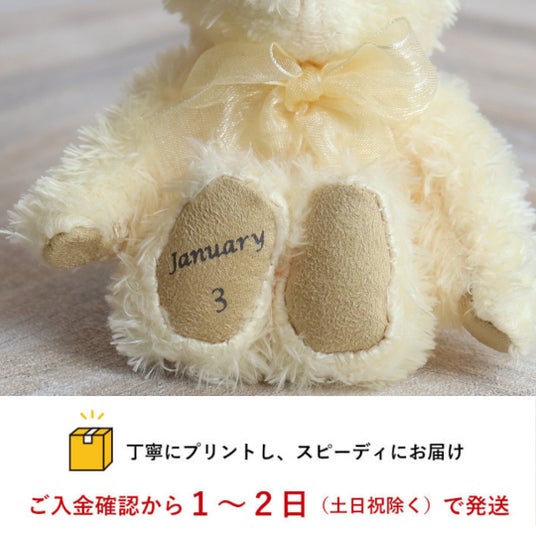ベアの足裏には、365日すべての記念日から好きな1日を選んでプリントが可能。誕生日はもちろん、記念日やイベント日など、大切な日をテディベアに刻むことで、パーソナルな贈り物や記念品として活用できます。