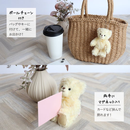 マスコットサイズのテディベアは、バッグや鍵に付けられるボールチェーン付き。両手にはマグネットが内蔵されており、カードを挟んだり“お祈りポーズ”をとるなど、日常に癒しを添える使い方も可能です。