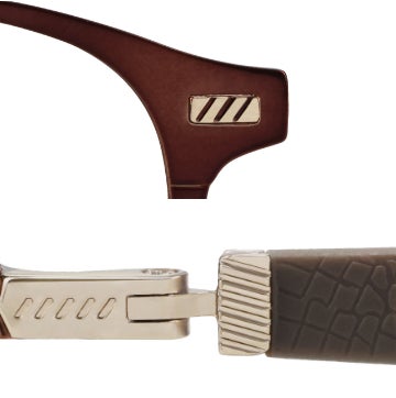 テンプルの内側には、ブランドのアイコンである「コーションロゴ」をメタルプレートで表現。ZA251025_14E1