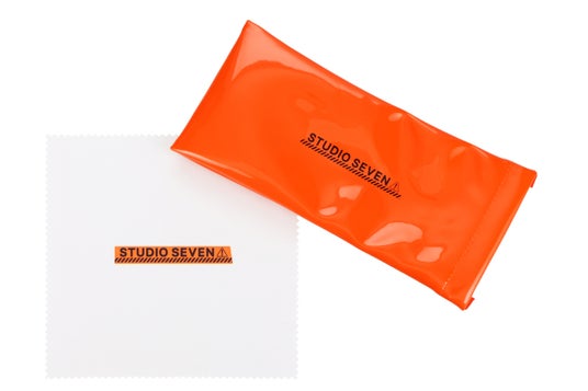 全てのフレームに、ブランドのアイコンである「コーションロゴ」を前面にデザインしたオリジナルケースとメガネ拭きがセット。