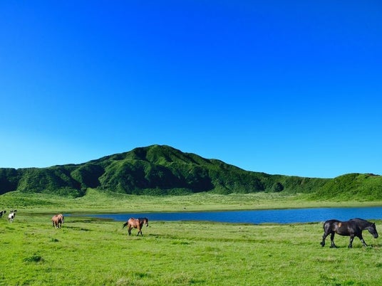 草千里ヶ浜阿蘇を代表する観光地のひとつ。標高約1,100mの高さにあり、放牧された馬が悠々と歩く姿や、噴煙を上げるダイナミックな阿蘇中岳が見渡せる絶好のロケーションです。夏は緑が鮮やかに輝き、厳冬期には幻想的な白銀の世界に包まれることも! 季節ごとに違った表情が楽しめます。