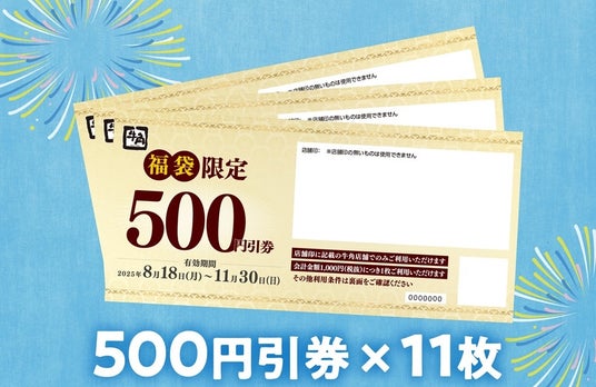 おトク1.:牛角で使える500円引券×11枚 おトク2.:デニム風オリジナルトートバッグ おトク3.:ビール1杯無料クーポン×1枚 商品名:牛角 夏の福袋 販売価格:5,000円(税込) 販売期間:2025年7月29日(火)~8月17日(日) 購入方法:牛角店舗にて購入いただけます ※牛角食べ放題専門店、牛角焼肉食堂、牛角成城学園前では販売しておりません ※1店舗当たり10袋~120袋の数量限定。なくなり次第終了 ※福袋購入時に、お食事いただく必要はございません ※在庫状況は店舗までお問合せください ※休業・閉店によりご利用いただけない場合がございます 未販売店舗 「東京」渋谷店、渋谷3rd店、渋谷道玄坂店、渋谷センター街店、池袋サンシャイン通り店、秋津店「神奈川」川崎店「埼玉」みはら店「岩手」北上店「福島」いわき小名浜店、福島鎌田店「富山」小杉店「栃木」鹿沼店「茨城」筑波学園北店「愛知」西尾店「大阪」なんば道頓堀えびす橋店、なんば千日前店、心斎橋店、梅田お初天神店「兵庫」三宮西店、神戸北店「福岡」天神西通り店「沖縄」泡瀬店 福袋内容