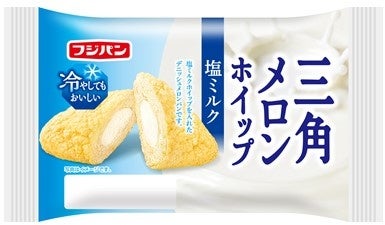 フジパンの人気シリーズ「三角メロンホイップ」は、ユニークな三角形の形状と、歯切れの良いデニッシュ生地、たっぷりのホイップクリームが特徴。この新作『三角メロンホイップ 塩ミルク』は、発酵バター入りマーガリンを使用した塩バター風味のメロン皮と、塩ミルクホイップの絶妙なバランスが魅力。冷蔵庫で冷やしてもクリームが固まらず、なめらかな口どけを楽しめます。夏の暑さにぴったりの爽やかな甘じょっぱさが、ひと口ごとに幸せを届けます!