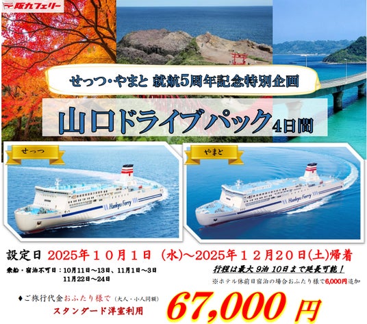 阪九フェリー「せっつ・やまと」の就航5周年を記念して、2025年10月1日から12月20日まで、兵庫・神戸六甲アイランド港または大阪・泉大津港から出港する「山口ドライブパック」を販売!ルートイン山口湯田温泉に宿泊し、角島灯台や元乃隅神社を巡る紅葉のドライブ旅を。2名で67,000円~(税込)、デラックス和洋室への変更も可能。船内の露天風呂と九州グルメ、温泉の癒しを堪能するプランを、ヴィーナストラベルで今すぐ予約!