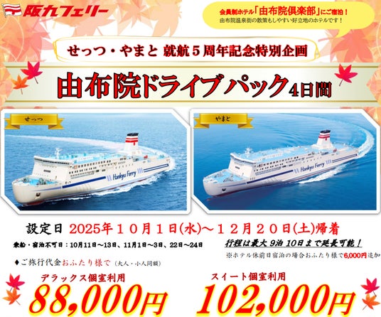 阪九フェリーの「せっつ・やまと」が就航5周年を記念して、2025年10月1日から12月20日まで、兵庫・神戸六甲アイランド港または大阪・泉大津港から出港する「由布院ドライブパック」を販売!会員制ホテル「由布院倶楽部」に宿泊し、九州産黒毛和牛の会席料理と露天風呂を堪能。デラックス個室で88,000円~、スイート個室で102,000円~(2名利用、税込)。紅葉のベストシーズンの九州旅行や帰省に最適なプランを、ヴィーナストラベルで今すぐ予約!